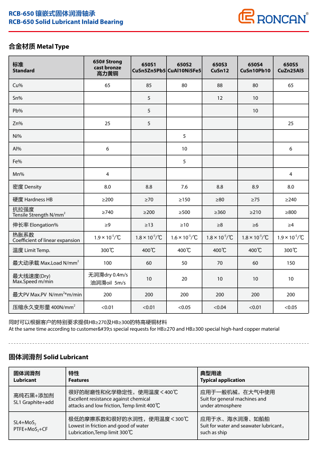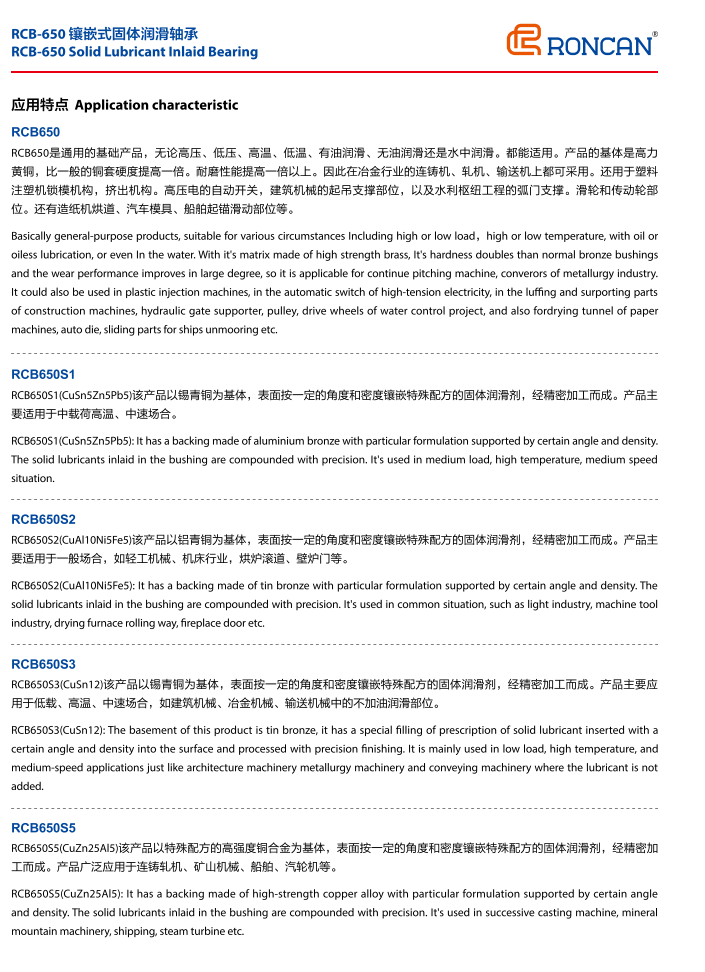 RCB650 является универсальным базовым продуктом, независимо от высокого давления, низкого давления, высокой температуры, низких температур, с масляным смазкой, без масла или с водным смазкой. Все подходит. Основой продукции является высокое содержание меди, что в два раза выше, чем в обычной медной оболочке. Производительность более чем в два раза улучшилась. Таким образом, в металлургической промышленности доступны все литейные, прокатные и конвейерные машины. Также используется в механизмах запирания и выдавливания пластмассовых инжекций. Автопереключатели высокого давления, места для поддержки подъёма строительных машин, а также дуговые двери для гидроузлов. Шкив и место передачи. Также есть бумажные трубопроводы, автомобильная плесень, места, где лодки поднимают якорь и скользятся, и т.д.